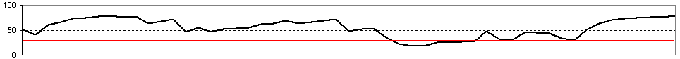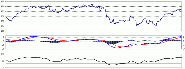 With all RSI values relatively high on the index, and the 7-week RSI value in overbought territory, no stars are awarded for this timing metric. A plot of the 7-week RSI indicator for the last year is shown below (lower chart) along with the price movement (upper chart) and a MACD chart (middle chart). Note how the indicator forecast the last good entry point earlier this year as it was flashing oversold at that time.