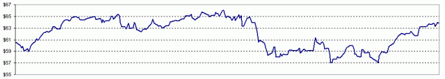 From the chart it can be seen that the stock has fluctuated from a low of approximately $57 to a high of approximately $66 throughout the past year. Relative to the closing price of $63.84 on October 26th, JNJ is trading the following distance from its 52-week high and low: