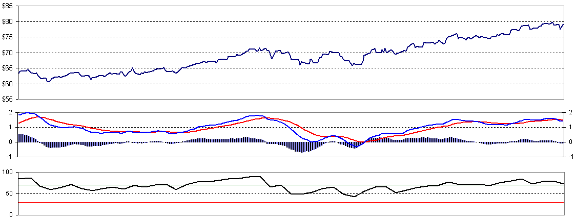 In addition to the simple screen based on 52-week highs and lows, I also track the 7-day, 7-week, and 7-month Relative Strength Indicator (RSI) values for each stock I follow. RSI is a momentum indicator that shows when stocks are overbought or oversold. When a stock is oversold on all three time frames (RSI < 30), that typically indicates a good time to buy. Similarly, when a stock is oversold (RSI > 70), that can indicate a good time to sell. The three RSI values for MCD are currently as follows: